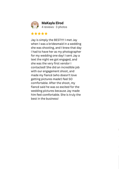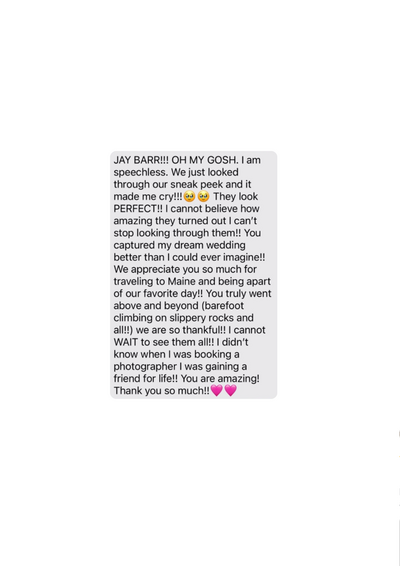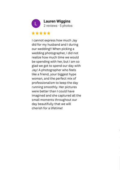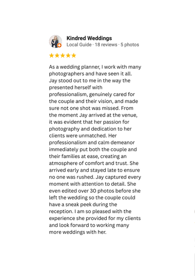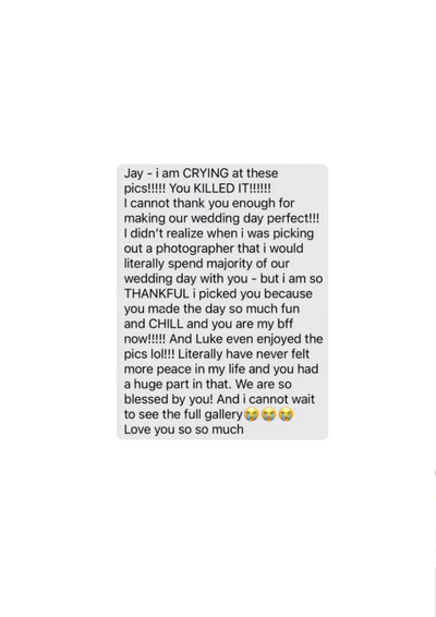 Jay, I just wanted to say thank you. Your professionalism and grace during a day that could have been so hectic is something we are immeasurably grateful for. The photos are stunning and we are so happy we used you