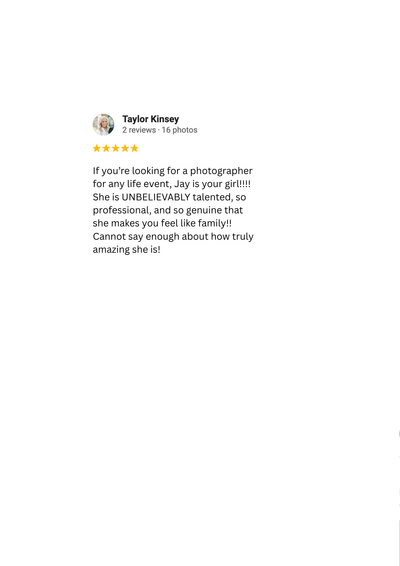Jay is unbelievably talented, and beyond fun to shoot with. Throughout the session, she made sure I was feeling confidently beautiful and embraced every bit of my personality. Her ability to capture a personality through her lens is incredible.