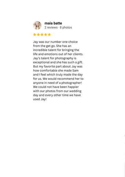 I typically don't enjoy being in front of a camera or the center of attention - Jay made me feel so comfortable in my own skin with a fun playlist, jokes, and great conversation the whole time. Her ability to turn our ideas into a perfectly executed vision made it so easy to trust her.